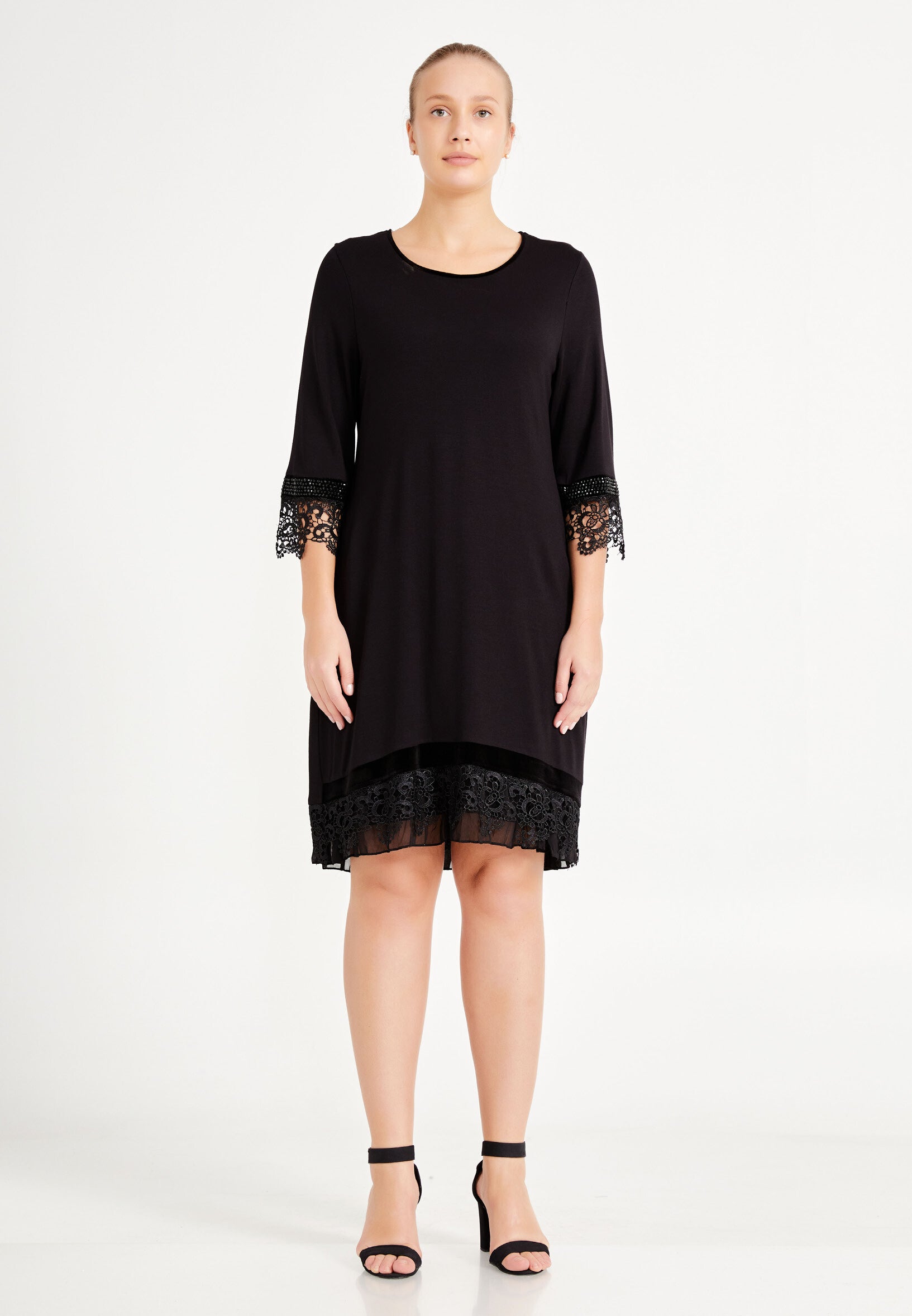 Zwarte cocktailjurk van zwaarvallende stof met kanten details en strass