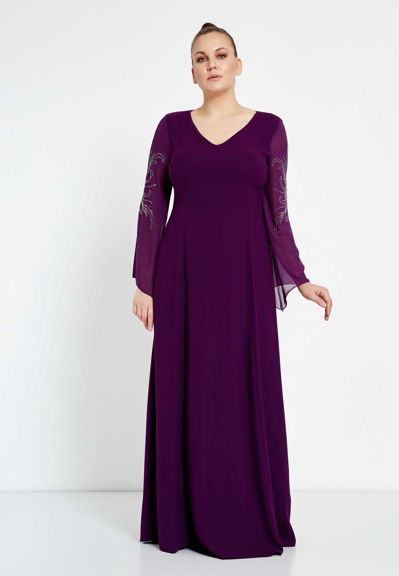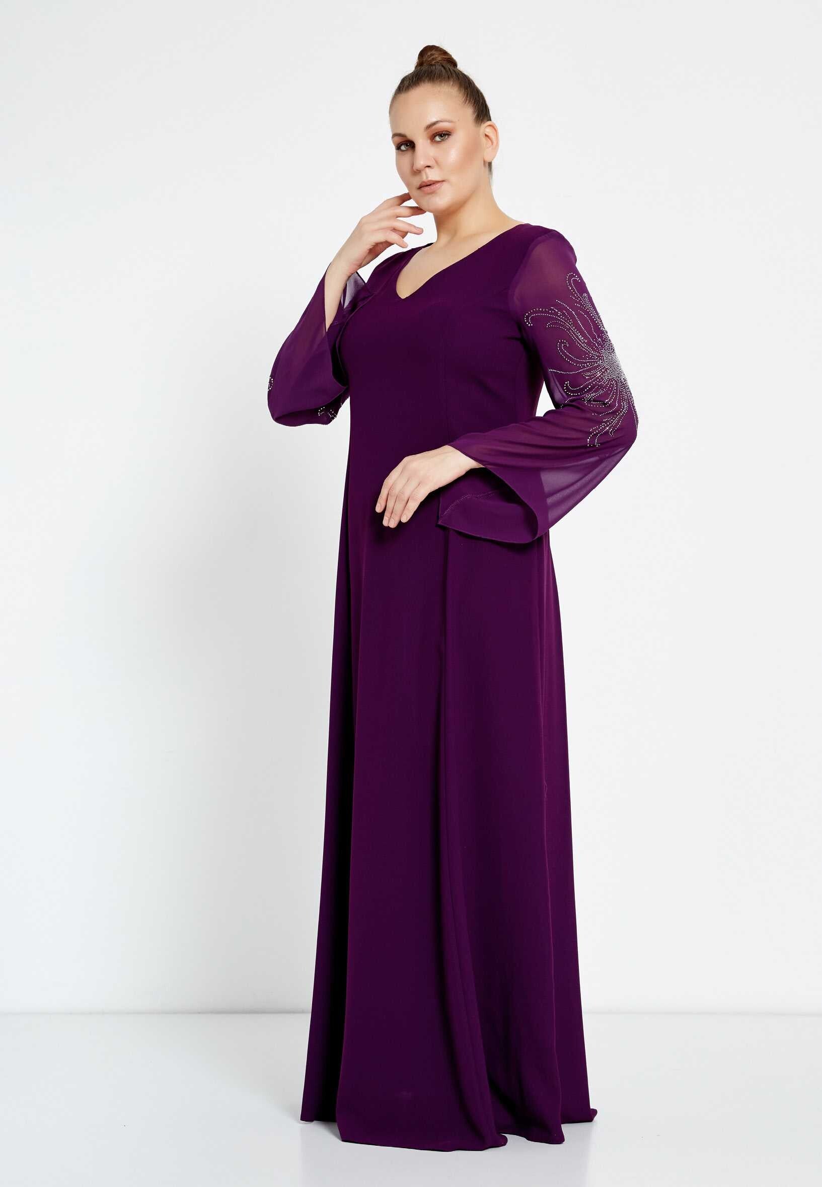 Elegante galajurk in donkerpaars met wijd uilopende, iets doorschijnende, mouwen met strass details.