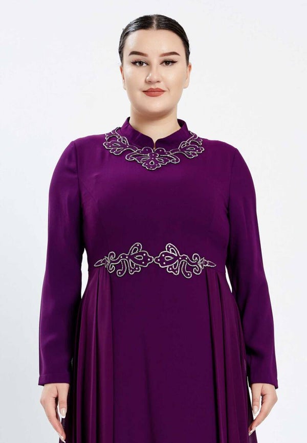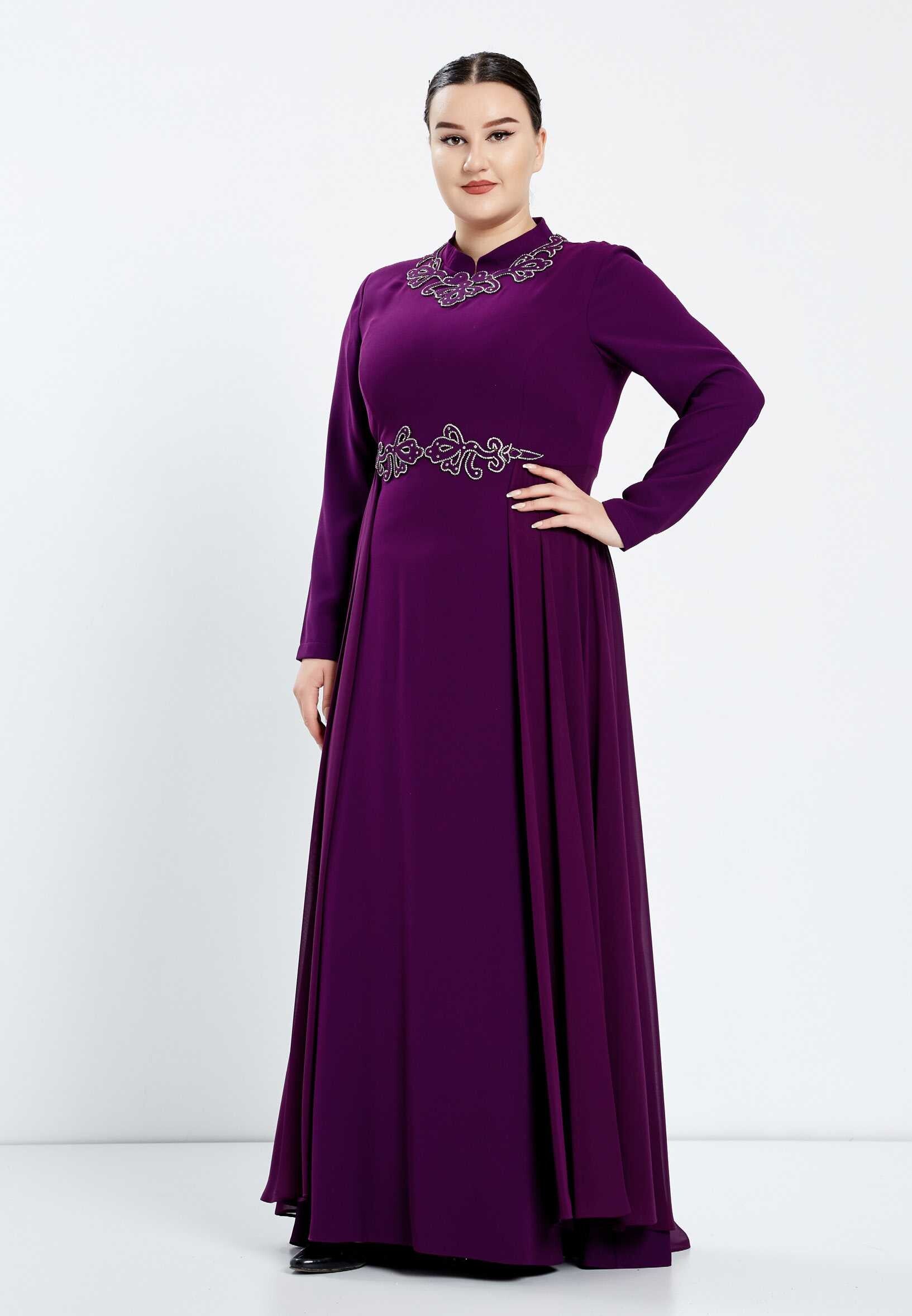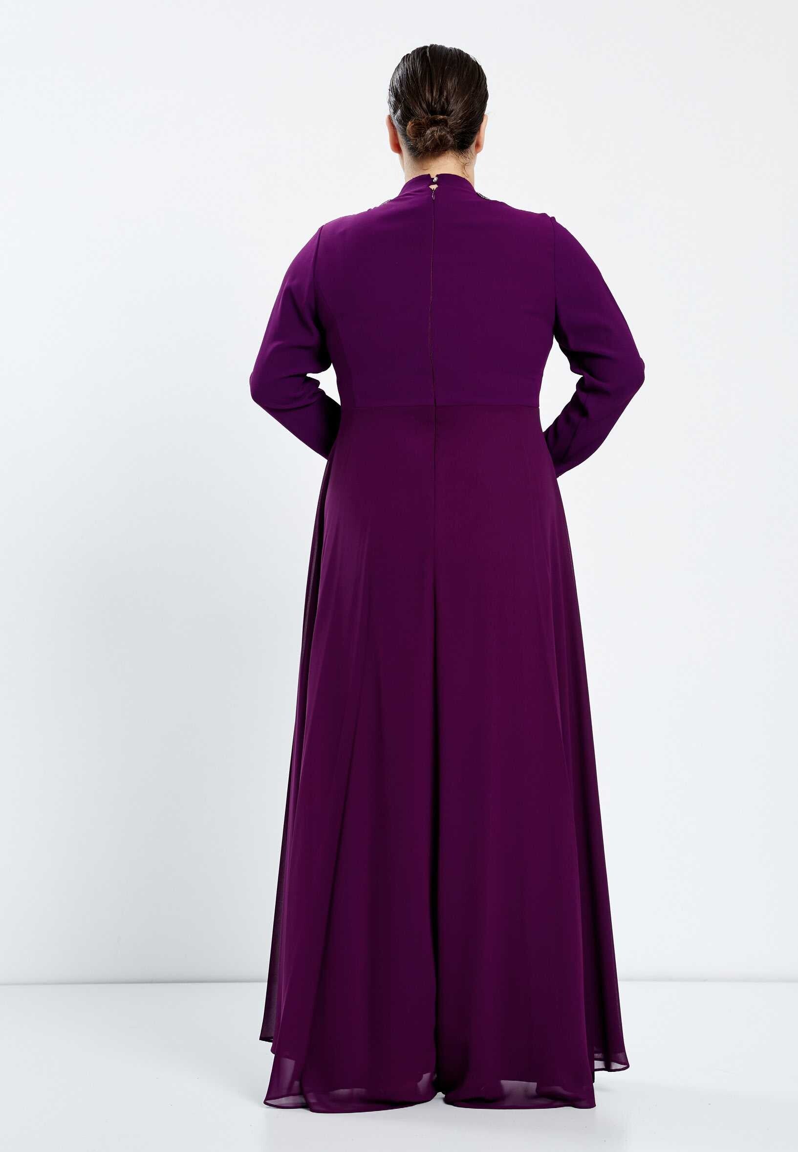 Elegante A-lijn paarse galajurk met niet afneembare korte sleep van chiffon en strass details