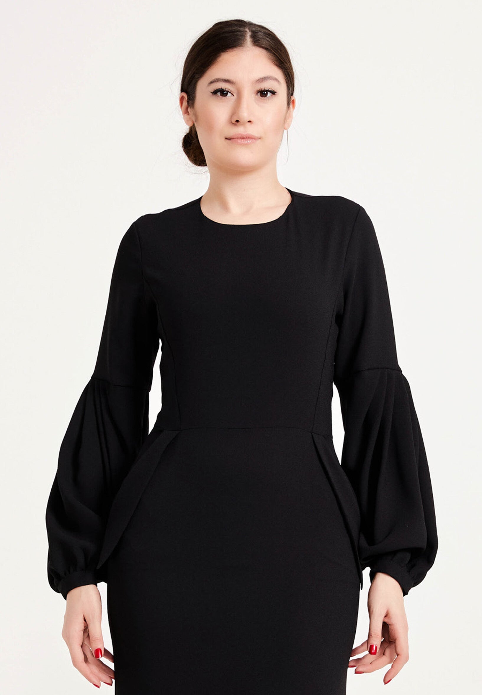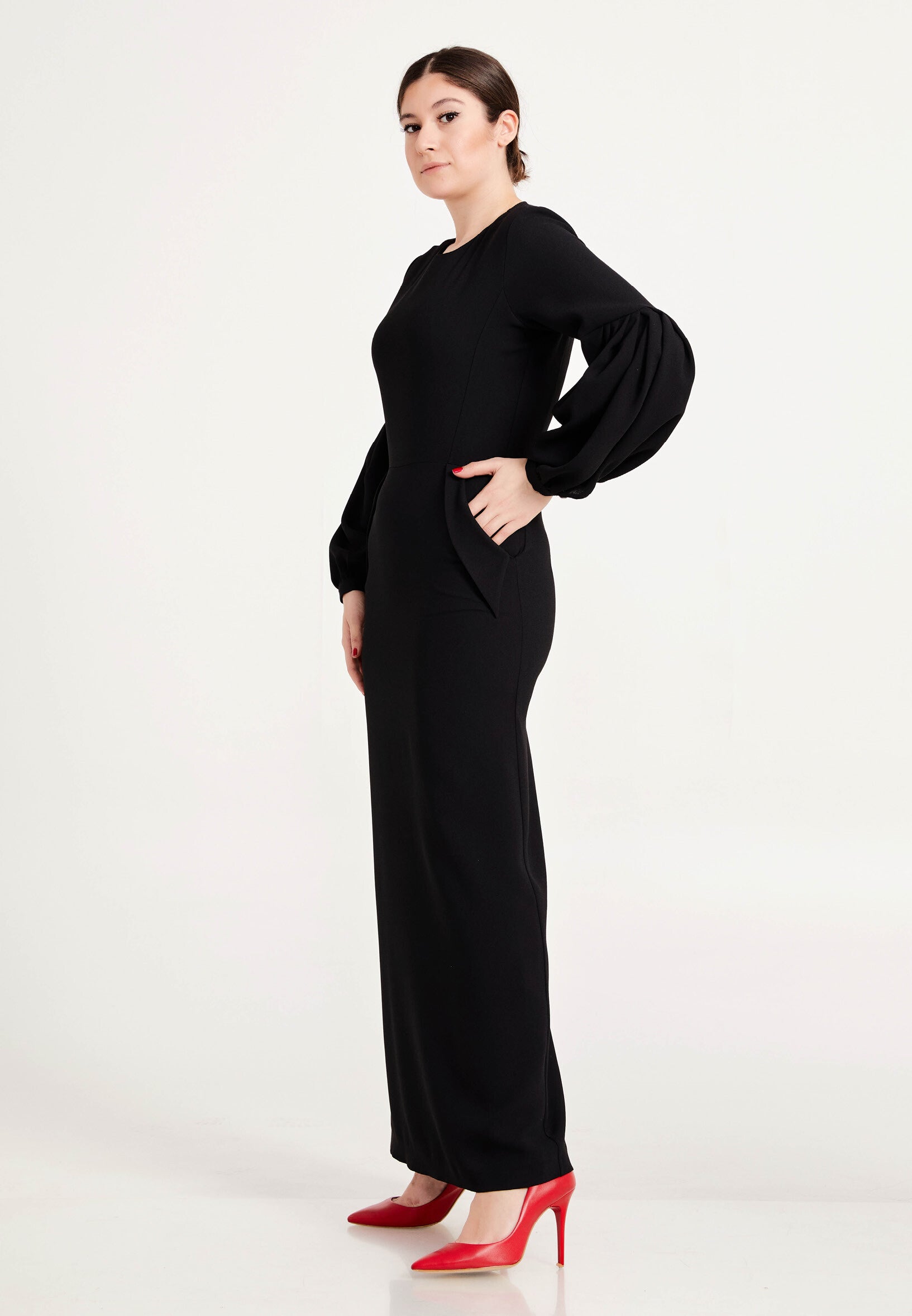 Zwarte maxi jurk van soepelvalend materiaal met halve bisschopmouwen, split aan de achterkant en zakken.