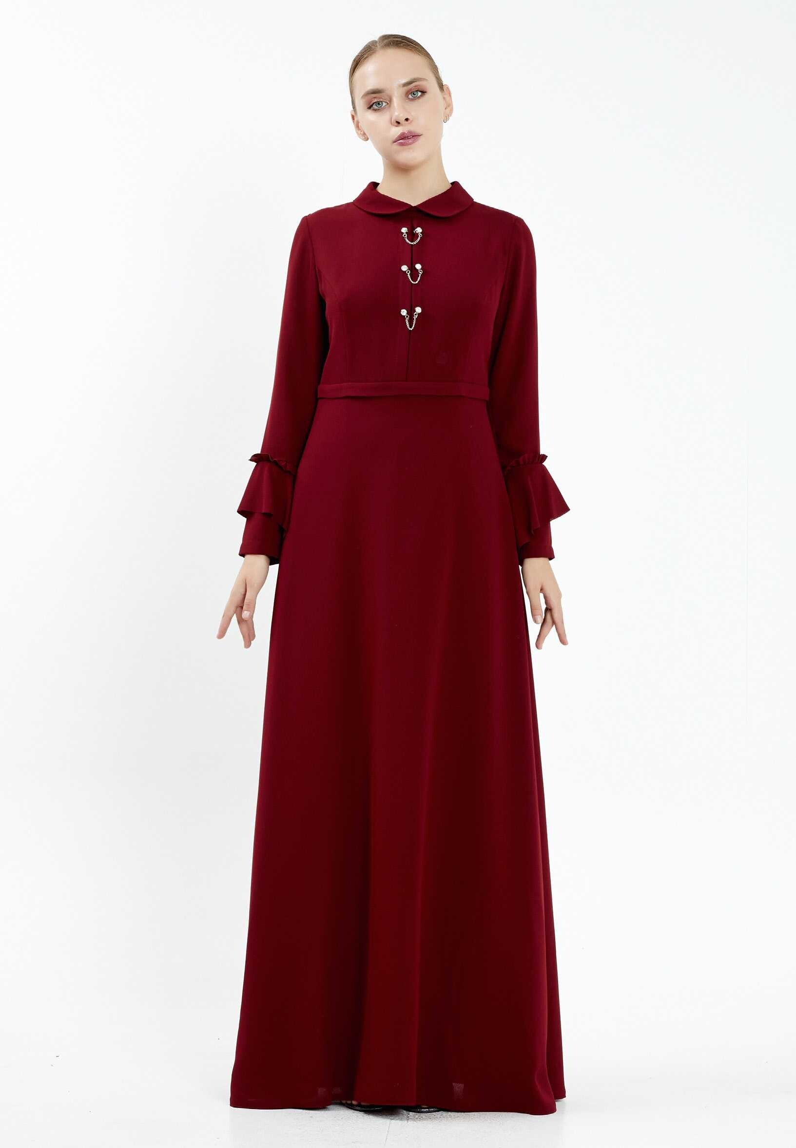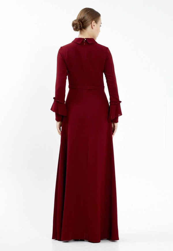 Bordeaux getailleerde soepelvallende maxi jurk met knoopeffect op het bovenlijf