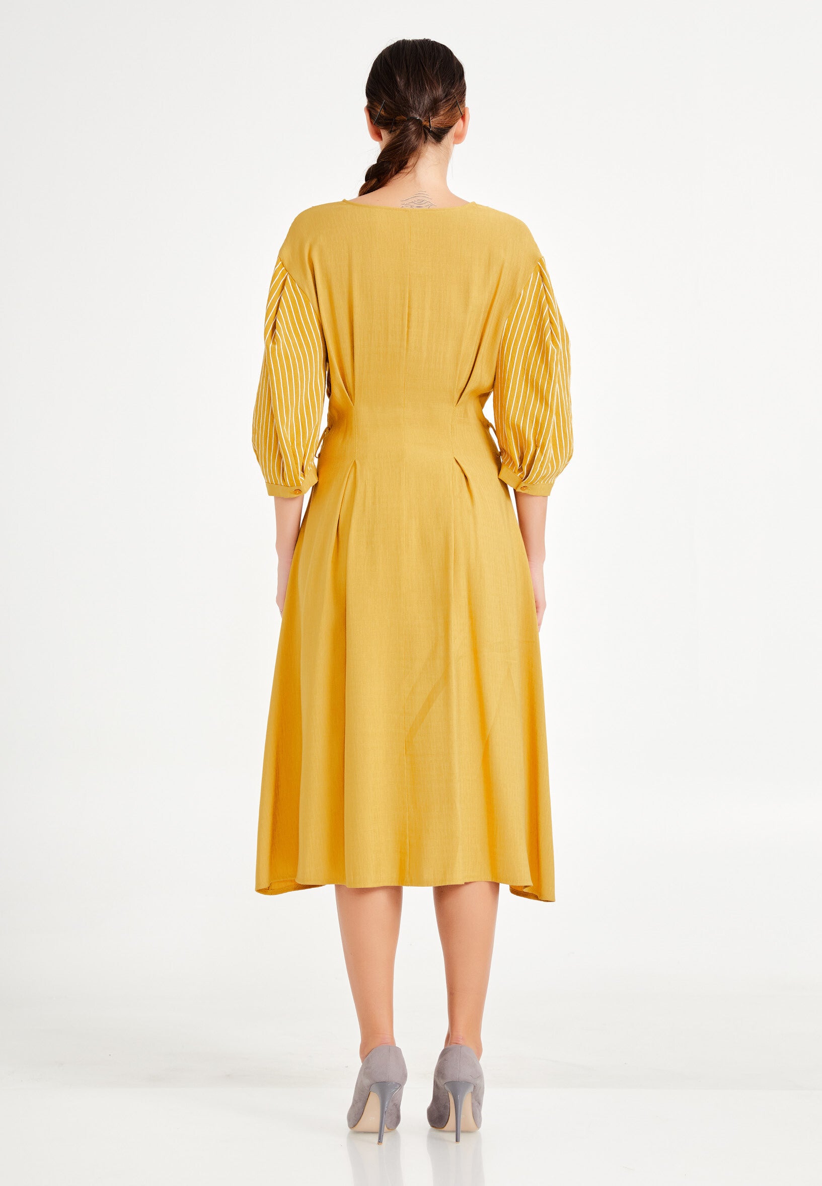 Okergele katoenen midi jurk met V-hals, 3/4 pofmouwen en bijpassende afneembare riem