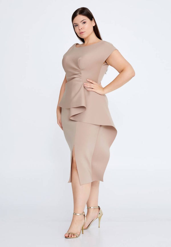 Beige gedrappeerde cocktailjurk van stretchstof met open rug, split en ritsdetail